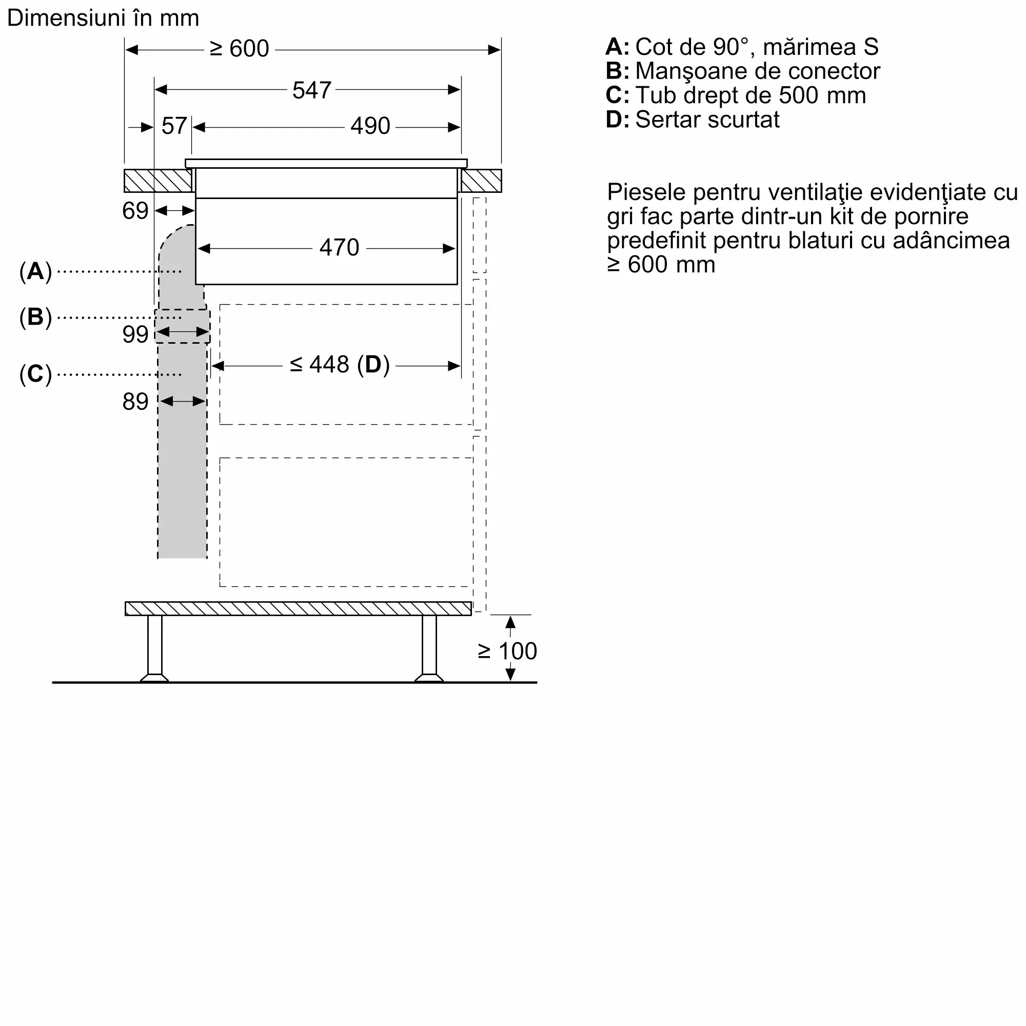 Kit de accesorii pentru instalare ȋn regim evacuare a plitei cu hotă integrată ȋn bucătării cu blat cu adâncimea de 60 cm sau mai mare.